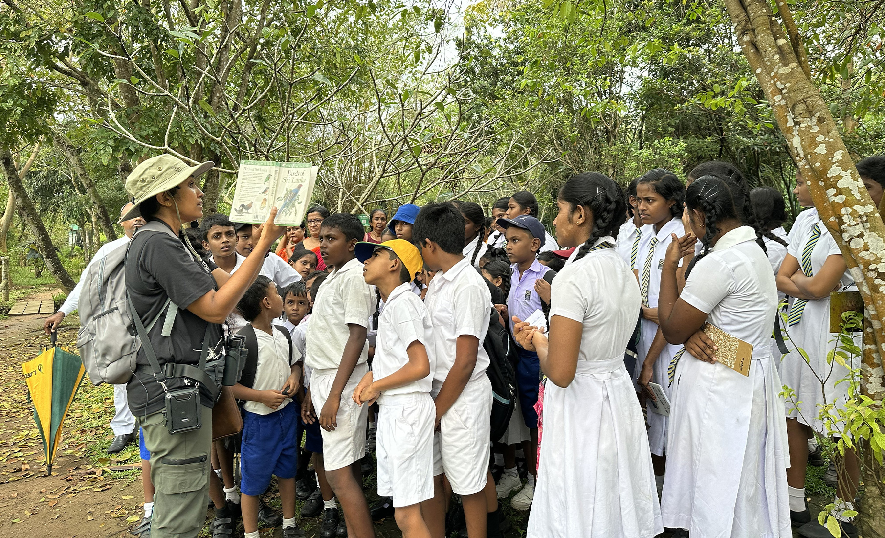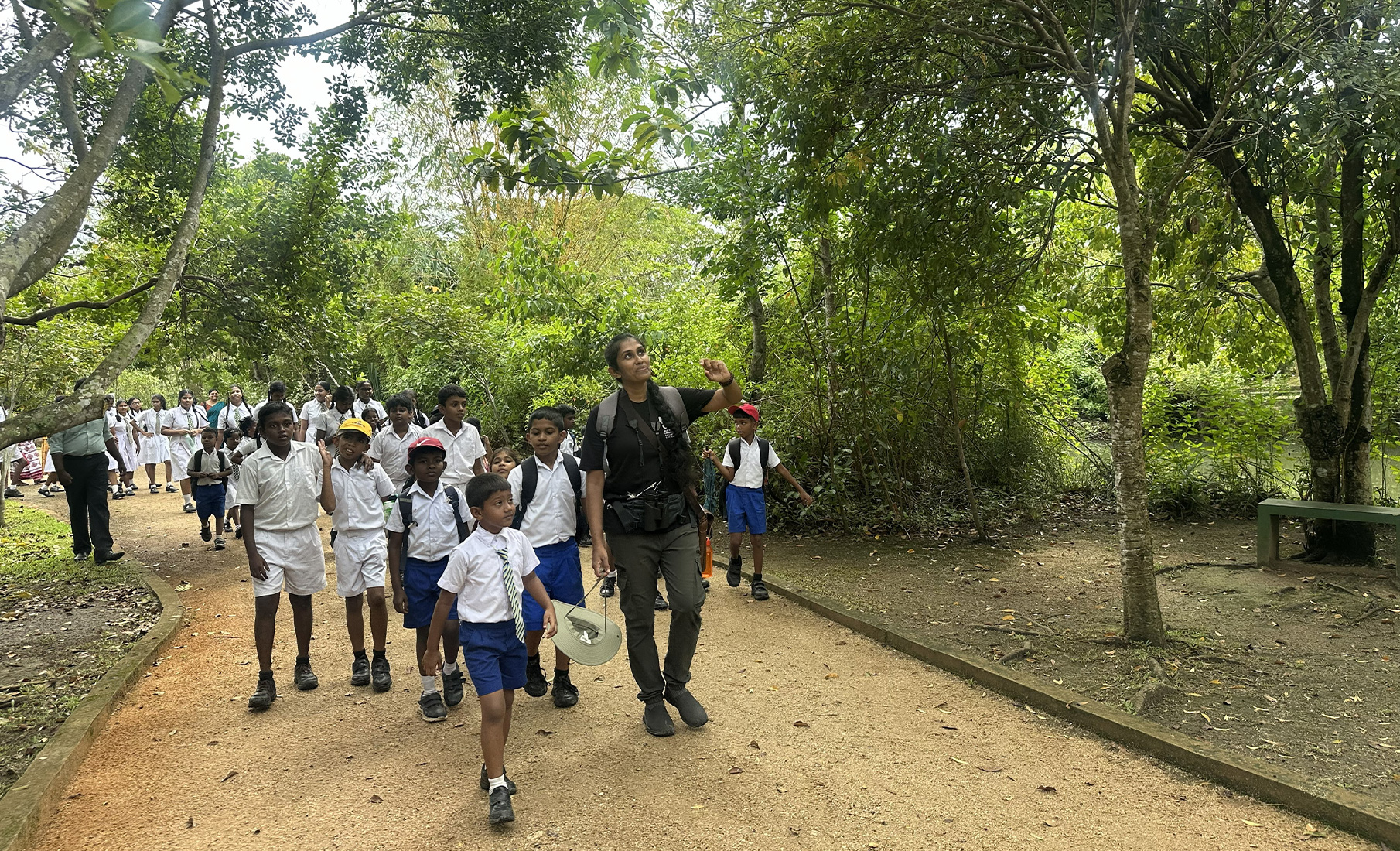 Narmadha then led the way into the thick of Diyasaru Park. The students followed her like a pack of wolves, carrying their little notebooks and pencils in hand. We had barely walked 50–100 meters inside when she stopped them and showed them a pond where dragonflies were fluttering around. The recent rains had meant most of the little creatures were hiding from plain sight, but that didn’t stop Narmadha from explaining the small ecosystem.